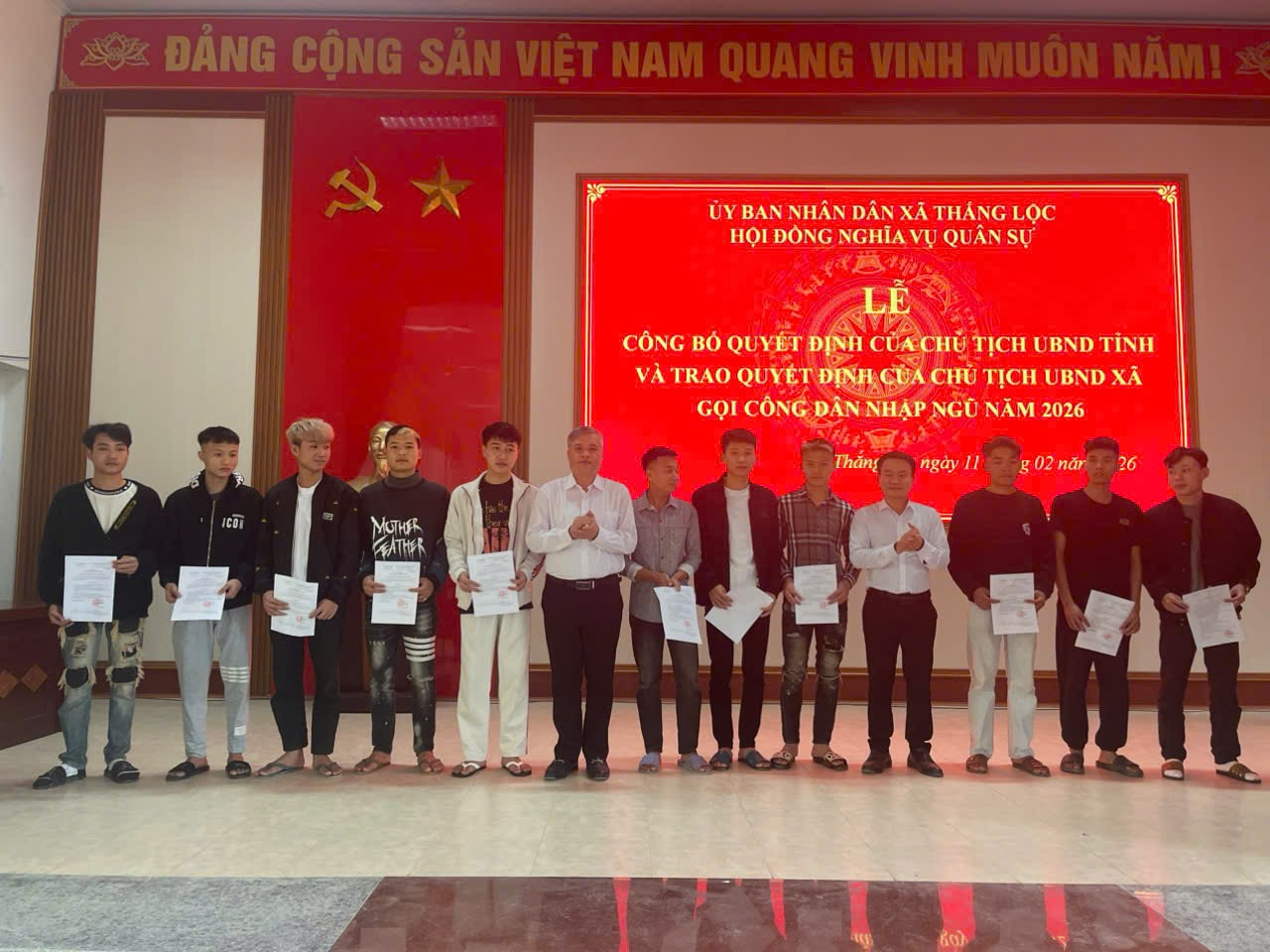 Chiều ngày 11/2/2026, Hội đồng Nghĩa vụ quân sự (NVQS) xã Thăng Lộc tổ chức lễ trao quyết định gọi công dân nhập ngũ năm 2026.