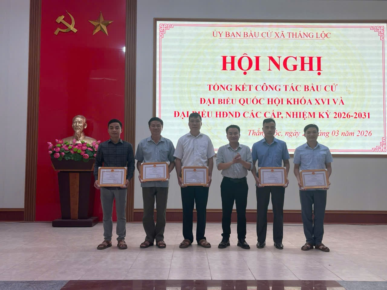 Dịp này, Uỷ ban bầu cử xã Thắng Lộc tặng giấy khen cho 4 tập thể và 5 cá nhân có thành tích tiêu biểu trong công tác bầu cử trên địa bàn xã.