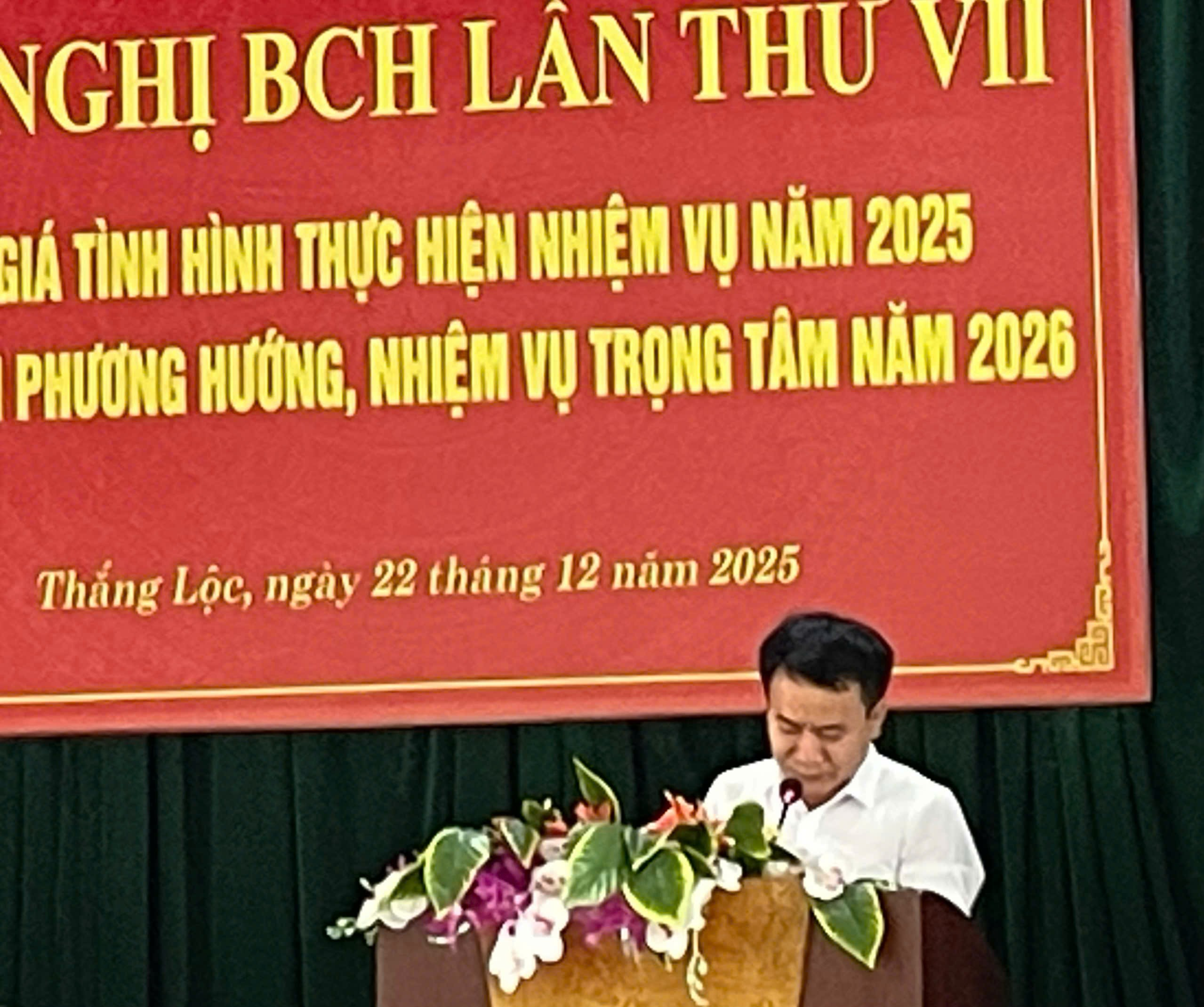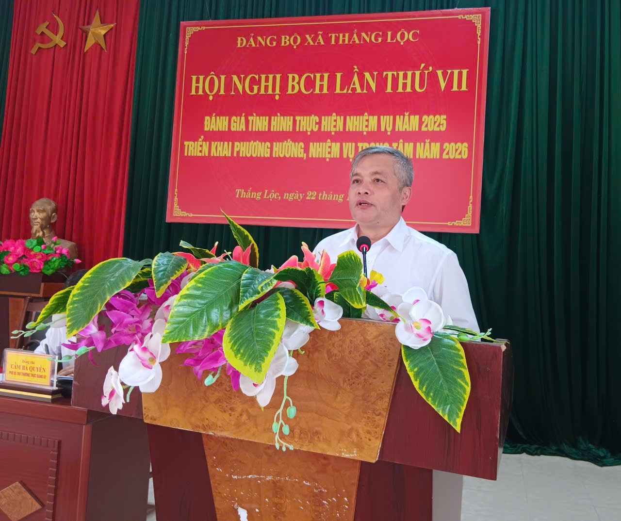 Chiều ngày 22/12/2025, dưới sự chủ trì của các đồng chí: Vi Ngọc Tuấn, Bí thư Đảng ủy, Chủ tịch HĐND xã; Cầm Bá Quyền, Phó Bí thư Thường trực Đảng uỷ; Lê Văn Hùng, Phó Bí thư Đảng uỷ, Chủ tịch UBND xã, hội nghị lần thứ VII, BCH Đảng bộ xã Thắng Lộc khóa I, nhiệm kỳ 2025-2030 được tổ chức để đánh giá kết quả thực hiện nhiệm vụ năm 2025; phương hướng, mục tiêu, nhiệm vụ năm 2026; thảo luận thông qua nghị quyết về mục tiêu, phương hướg, nhiệm vụ năm 2026; cho ý kiến về các Báo cáo: kết quả thu ngân sách nhà nước, chi ngân sách xã năm 2025; tình hình giải ngân vốn đầu tư công năm 2025; kết quả thực hiện giải phóng mặt bằng; công tác kiểm tra giám sát và thi hành kỷ luật đảng năm 2025; công tác lãnh đạo, chỉ đạo của BTV Đảng uỷ, Thường trực Đảng uỷ xã năm 2025; Dự toán thu-chi ngân sách nhà nước, chi ngân sách địa phương và phương án phân bổ ngân sách năm 2026.