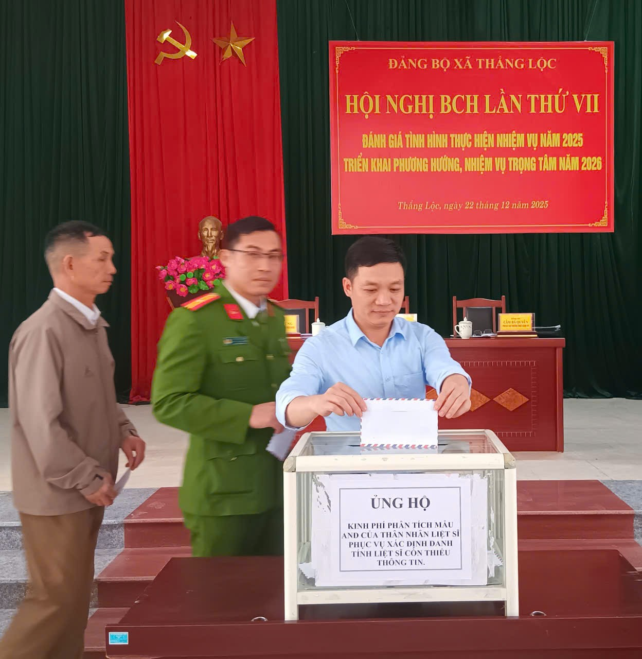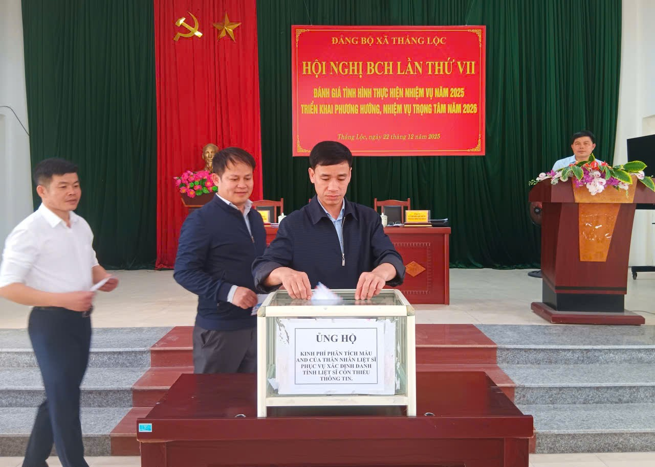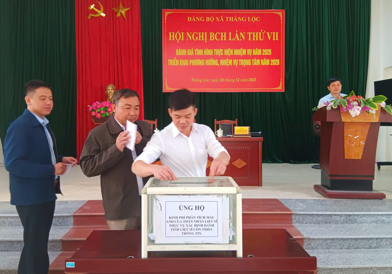 Tại hội nghị, Ban chấp hành Đảng bộ xã Thắng Lộc đã tổ chức quyên góp, ủng hộ kinh phí phân tích mẫu ADN của thân nhân Liệt sĩ, phục vụ xách định danh tính hài cốt Liệt sĩ còn thiếu sót trên địa bàn tỉnh Thanh Hóa.
